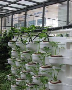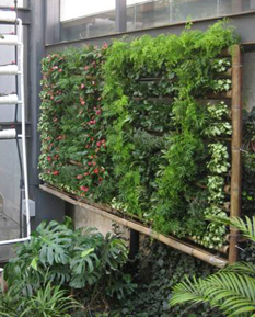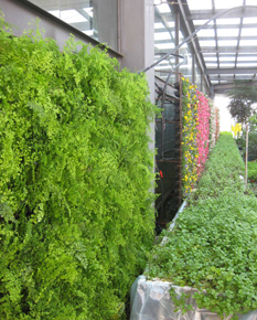 自给型模块式垂直生态墙制作关键技术项目针对传统垂直绿化形式和方法进行创新,旨在改变植物配置、灌溉和种植思路,拓展植物在复层空间上的高效种植模式。根据2013年地方高校国家级大学生创新创业训练计划项目要求,农学院2012级园艺一班武学志等5名学生在黄鹤平、郑旴、李志兵和赵明方等老师指导下,结合阳光中庭学生实习实训基地的建设提升工作,完成了壁挂式竹筒观叶植物墙、双面观赏食用西芹墙、垂直草花模纹墙、管道并联式草莓墙、铁线蕨生态墙和管道联通式水培蔬菜墙面的设计、支撑物和营养供运系统的选择安装与调试、栽培基质的不同配比试验和植物选择与配置等工作。经过近一个月加班加点组织施工,在前期工作经历过多次工程试验探索失败的基础上,反复修正工程技术工艺,终于建成110 m2的一系列花卉生态立体墙面景观,使温室垂直面上的空间得到了高效利用,环境空间的景观分隔对比效果得到显著加强。