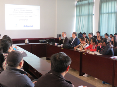 报告会上,Achille Pattavina教授首先作了《高效节能的弹性光传输网络》的主题报告,他从光传输网络面临的能耗和网络可靠性两个问题(挑战)出发,介绍了在保证网络可靠的前提下,如何降低能耗,并详细介绍了他在高效节能的弹性光传输网络方面所开展的研究工作。