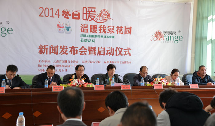 11月24日上午,由德赢VWIN官方网站、云南省园林行业协会和昆明奥润居园艺有限公司共同发起的“2014昆明花园植物防寒抗冻保暖公益活动”新闻发布会暨启动仪式在德赢VWIN官方网站农学院举行,来自云南省园林行业协会、都市时报、云南信息报、春城晚报、生活新报、加油周刊、中国花卉报、莲花物业、海岸艺景物业、鸿亿鑫物业等多家新闻媒体和物业公司参加了此次新闻发布会。德赢VWIN官方网站副校长熊晶、农学院班子成员和部分师生代表共100余人参加了启动仪式。会议由昆明奥润居园艺公司杨有超经理主持。
