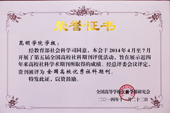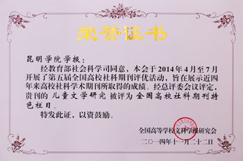 近日,历时半年的第五届全国高校社科期刊评优活动在广州圆满结束。在本次评优活动中,《德赢VWIN官方网站学报》被评为“全国高校优秀社科期刊”,学报重点栏目《儿童文学研究》被评为“全国高校社科期刊特色栏目”。这是继去年在“第四届云南期刊奖评”中获得“云南优秀期刊奖”以来,《德赢VWIN官方网站学报》取得的又一佳绩,也是德赢官网学报连续两届获得“全国高校优秀社科期刊”和“全国高校社科期刊特色栏目”奖。