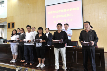 仪式上, 熊厅长和学校领导为学员代表颁发了养老护理培训结业证书。