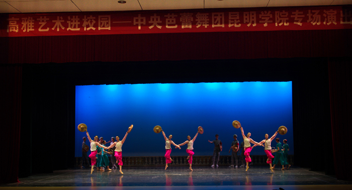 据了解,这是中央芭蕾舞团走进高校的首站演出。本场演出由中央芭蕾舞团大师,总排练者徐刚主导,首席主演张剑,主要演员余波,青年演员李洁,佟锦昇等领衔演出。整个会堂座无虚席,许多同学告诉记者,他们很早就来到了学生会堂外等候,甚至七点演出开始后,仍然有许多同学等在会堂外面,因为座位已全部坐满而失去了观看演出的机会,对此场外的同学们深表遗憾。而会堂内天蓝色的背景墙,芭蕾舞者身着蓝色芭蕾舞裙,在舞台上时而跳跃时而俯身,柔软的身姿轻盈的舞蹈给在场的观众们营造了仙境般的感觉,仿佛行走在云端的蓝色精灵快乐的起舞 ——21位演员用自己精湛的舞姿为大家带来了一场难忘的演出。