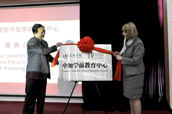 蒋永文校长在仪式上致辞。他首先代表学校欢迎加拿大凯布莱恩学院副校长布朗女士一行到德赢官网参加“中加学前教育中心”揭牌仪式表示热烈欢迎。他说,从去年10月至今,德赢VWIN官方网站与加拿大凯布莱恩学院的合作,在加拿大驻重庆总领事馆的积极推动下,今天迎来了 “中加学前教育中心”的成立,标志着两校合作迈出了历史性的重要一步。凯布莱恩学院位于加拿大安大略省萨德伯雷市,这座城市也是约翰斯顿总督的故里,这也为我们之间的合作增添了特殊的意义。在这里,特别感谢加拿大凯布莱恩学院副校长布朗女士、国际部主任道顿先生和中国项目负责人杨传秀女士为“中加学前教育中心”的成立所做的大量工作,感谢云南省教育厅和加拿大驻重庆总领事馆为两校的合作提供的大力支持,感谢加拿大驻重庆总领事馆教育专员廖忠博士在“中加学前教育中心”筹建的过程中提供的所有帮助和指导。