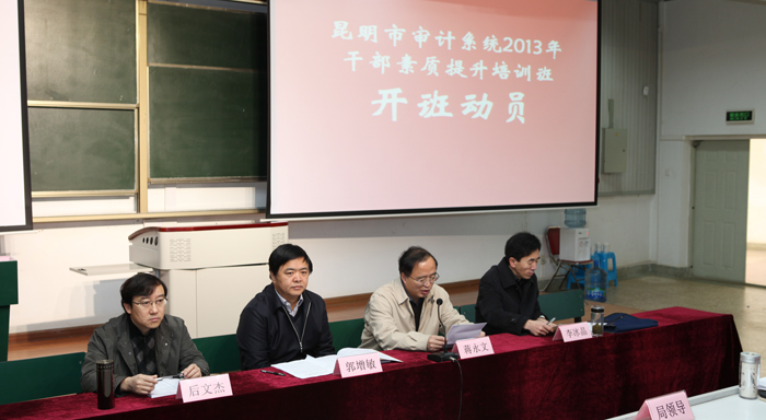 12月5日上午,“昆明市审计系统2013年干部素质提升培训班”开班动员大会在德赢官网博识楼2003报告厅举行。德赢官网党委副书记、校长蒋永文,昆明市审计局党委书记郭增敏,昆明市审计局局长李冰晶出席开班动员大会。会议由昆明市审计局机关党委书记后文杰主持。