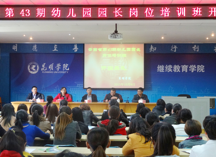 10月9日,云南省第43期幼儿园园长岗位培训班在德赢官网继续教育学院正式开班,昆明市教育局副局长李瑞林、师训处处长王建方,德赢官网继续教育学院院长陈嘉、副院长张培宏出席开班典礼并讲话。本期培训班共有来自全省的73名幼儿园园长参加,集中培训时间为3个月。