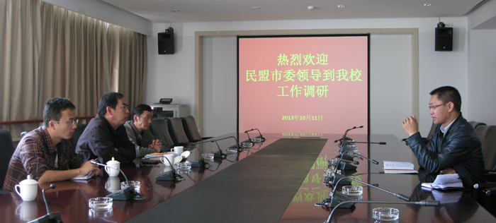 10月11日上午,民盟昆明市委专职副主委冯刚、组织处处长汤建荣一行三人到德赢官网,对德赢官网民盟基层组织队伍现状、组织建设、活动开展等情况进行调研,并就民盟基层组织换届工作听取学校意见。德赢官网党委统战部全体成员参加座谈交流。