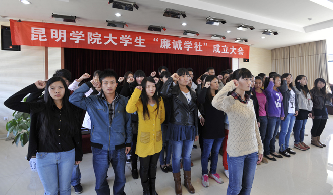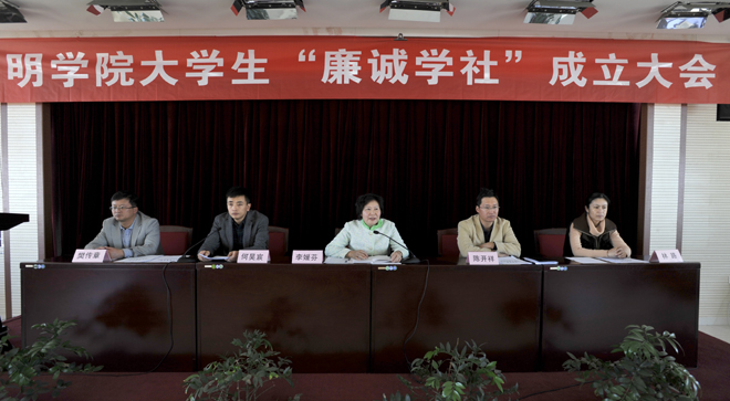 成立大会上,大学生“廉诚学社”申请人经济学院2010级财务管理班孔杉杉同学宣读了社团成立申请;校团委副书记樊传章代表团委和学生社团联合会宣读了社团成立的批复;大会表决通过了大学生“廉诚学社”社长、副社长人选;表决通过了《大学生廉诚学社章程》;新当选的大学生“廉诚学社”社长孔杉杉同学、副社长雷芝银同学、李亚霖同学分别作了表态发言;全体社员进行了严肃认真的入社宣誓。