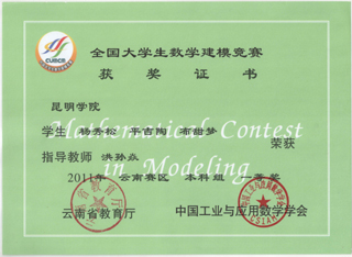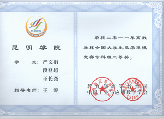 近日,2011年“高教社”杯全国大学生数学建模竞赛组委会公布了竞赛的获奖名次。德赢官网信息技术学院学生取得国家二等奖、云南赛区一等奖和二等奖各1项的优异成绩