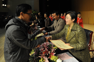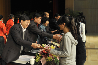 德赢官网李翔副校长宣读了《德赢VWIN官方网站关于表彰2011年度“红和助学金”获奖学生的决定》。此次学校评出50名同学获得2011年度一等红河助学金,85名同学获得二等红河助学金。参会领导为获奖学生代表颁发了奖状和奖金。随后,受助学生代表孔杉杉发表了感言,表达了广大受助贫困生奋发向上,刻苦学习,实现自我的信心和决心。