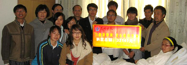 各院系的学生代表带着德赢VWIN官方网站师生的爱心和良好祝愿看望了缪信合同学,大家跟她说:“你是我们德赢VWIN官方网站的一员,因此你不是一个人,我们和你在一起。”并转交了总额为人民币33141元的爱心捐款,缪信合非常感谢学校对自己的关心,表示自己一定努力配合治疗,争取早日到校和同学们一起学习、一起生活,以报答学校、老师和同学对她的关心和帮助。