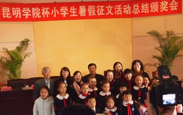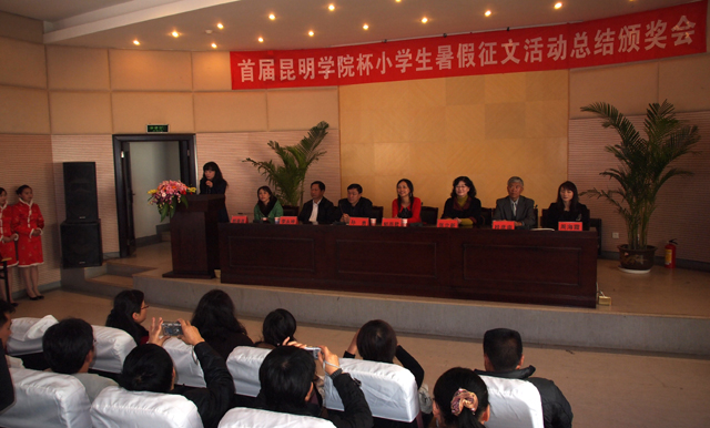 的学校和同学积极踊跃,认真准备。征稿活动结束后,由专家和教师组成的评委会从参赛学校中评选出30所学校获得优秀组织奖,评选出20位教师获得优秀教师指导奖。从收到的13200多篇征文中评选出优秀征文特等奖10名,一等奖20名,二等奖40名,三等奖60名,优胜奖100名。 此次活动的总结颁奖会于11月12日下午在昆明图书馆报告厅隆重举行。出席的领导有德赢VWIN官方网站党委副书记孙勇,校党委宣传部部长张立新、人文学院院长桂彦南,昆明市文联副主席李永坤,昆明市委宣传部文教处处长周海霞,昆明市图书馆馆长郭春莲,著名儿童文学作家郁雨君,明天出版社文学编辑室主任孟凡明,明天出版社营销