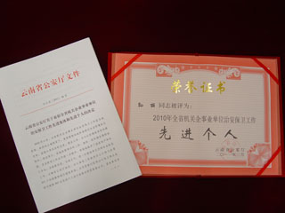 近日,云南省公安厅对2010年全省机关企业事业单位内部治安工作进行表彰,德赢VWIN官方网站保卫处再次获得“全省机关企业事业单位治安保卫工作先进集体”称号;保卫处副处长孙丽同志获得“全省机关企业事业单位治安保卫工作先进个人”称号(云公治[2011]46号)。这是保卫处在云南省公安厅对全省企业事业内部单位治安工作表彰中第三次蝉联该项荣誉称号。