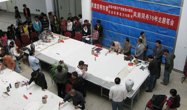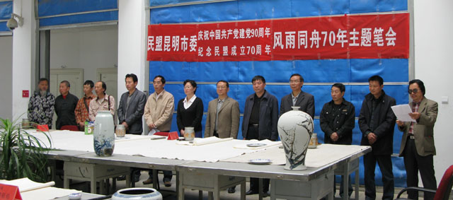 4月20日上午,美术与艺术设计学院教学楼大厅内群贤毕至,少长贤集,翰墨飘香、欢声笑语,洋溢在一片热烈而祥和的气氛之中。“民盟昆明市委庆祝中国共产党建党90周年、民盟成立70周年——风雨同舟主题笔会”在这里隆重举行。 出席开幕式的领导有:云南省政协副秘书长、民盟云南省委副主委徐宁、昆明市人大常委会副主任、民盟昆明市委主委夏静,中共昆明市委统战部调研员贾天鹏、党派处处长许广,中共德赢VWIN官方网站统战部部长张云权,市政协常委、民盟昆明市委副主委冯刚,市人大代表、民盟昆明市委副主委、德赢VWIN官方网站美术与艺术设计学院院长武新文。 应邀出席笔会的书画家有:云南省美术家协会副主席、云南画院副院长、云南美术馆副馆长、国家一级美术师郭游,云南书法家协会常务副主席、国家一级美术师孙源,云南省艺术教育委员会常务委员、德赢VWIN官方网站美术与艺术设计学院院长武新文,云南画院著名画家李平、杨正国,民盟市委知名画家黄片石、朱仲元、魏祖右。 民盟昆明市委机关的有关干部和美术与艺术设计学院师生近100人参加了开幕式。