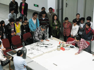笔会开幕式由民盟昆明市委副主委冯刚主持,民盟昆明市委副主委、德赢VWIN官方网站美术与艺术设计学院院长武新文向与会领导、书画家和师生致辞。 在热烈而祥和的气氛中,书画家们以饱满的热情、精湛的技艺、生动的形象、挥毫泼墨、借物抒情,热情讴歌中国共产党90年的丰功伟绩和改革开放波澜壮阔的光辉历程,歌颂民盟70年与中国共产党风雨同舟、荣辱与共的光辉历史。 在德赢官网举办省、市、学校盟内书画名家笔会活动,用书画艺术传承了多党合作历史,弘扬统一战线文化,共同创作和谐书画作品,必将有利于校内外盟员联手共创和谐校园、和谐昆明,和谐社会,必将促进省、市盟内上下级之间和校内外书画家之间的相互交流和切磋,必将为德赢官网和昆明市的和谐文化建设增添浓墨重彩的一笔。 在教学楼大厅,书画家们精益求精的创作表演深深吸引着美术与艺术设计学院的师生们,他们十分珍惜各位书画名家的亲临指导和现场献艺的机会。本次笔会的举办,一方面起到了书画艺术的教育作用,让学生大开眼界,另一方面还为美术与艺术设计学院开展对外交流搭建了好的平台。