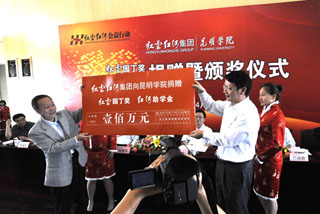 随后高峰副省长等在主席台就坐的与会领导向受奖获助师生颁发证书,红云红河集团向德赢VWIN官方网站捐赠奖教助学金100万元,德赢VWIN官方网站回赠红云红河集团“红云映辉暖园丁,红河奔腾泽学子”牌匾。