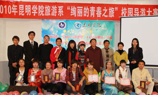 本次校园导游大赛邀请到了昆明市旅游局培训中心贾云辉主任,全国名导、山东省烟台市蓬莱阁管理处导游科科长王晓楠,昆明市导游协会副会长方泽华,省级教学名师、文新系尹相如教授,著名歌唱家、音乐系郭海波副教授担任评委。昆明市政府接待办肖樱主任也莅临现场,准备为昆明市政务接待挑选优秀导游。同时,大赛还邀请到了刚刚参加完西安全国导游大赛的三位云南省金牌导游黄绍军、董芸、刘丹到现场进行表演。