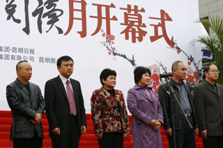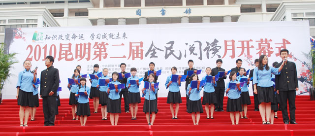 开幕式在我院文学与新闻传播系学生吟诵《大观楼》长联的朗朗声中拉开了序幕。市委宣传部李勇毅副部长在开幕式上致辞指出:举办“全民阅读月”活动,旨在倡导全民阅读,树立读书学习的文明风尚,这是回应时代呼唤、迎接时代挑战的有力举措,对于推动科学发展、促进社会和谐有着十分重要的意义。本届“全民阅读月”与去年举办的首届活动相比,内容更丰富、涉及面更广、针对性和互动性更强。活动分为面向领导干部和面向全体市民的两大活动板块。从今天开始,为期一个月的阅读月将相继举行 “百科知识竞赛”、图书捐赠、读书形象大使评选、书香宝贝评选、知名作家签售等一系列精彩纷呈的活动。希望全体市民以“阅读月”活动为契机,把读书学习作为一种生存状态、一种生活习惯、一种生命追求,树立终身学习的理念,不断充实自我、完善自我、超越自我,提高自身综合素质,为新昆明的发展建设提供强大的精神动力和智力支持。他表示昆明市要将这一项长期的公益性文化事业,打造成为昆明重要的文化品牌活动。