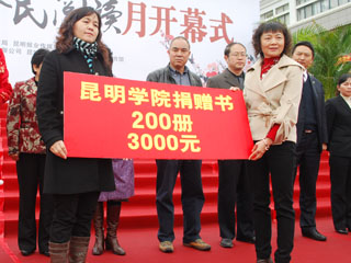 开幕式上,市政府副主席、市文联主席汪叶菊宣布 “2010昆明第二届全民阅读月”活动开幕!我院文学与新闻传播系学生代表宣读了德赢VWIN官方网站师生向全体市民发出的阅读、学习的倡议。同时,我院图书馆馆长何琍芳、副馆长曹卫华代表德赢VWIN官方网站向贫困地区儿童捐赠内容涉及教育、科普、世界名著、文学、经济等知识的图书200余册。