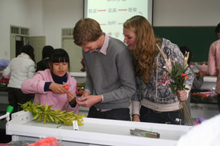 随后系里邀请荷兰同学一起动手制作花束,两国同学对艺术对美的欣赏是相通的,仅仅用了短短一节课的时间三位外国同学就亲手制作出了各具特色的花束,在色彩的搭配上还真让我们感受到了异域特色。两国同学围坐在自己亲手制作的花束周围,就今后的择业就业问题、教育体制、饮食习惯等方面的话题进行了轻松热烈的交流。