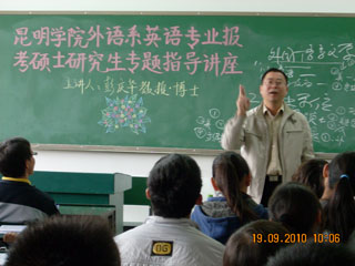 为帮助外语系学生备战硕士研究生入学考试,在外语系领导和团总支的共同努力下,10月26日下午3点, “德赢VWIN官方网站外语系英语专业报考硕士研究生专题指导讲座”在德赢VWIN官方网站博文楼2--103教室拉开了帷幕。云南师范大学外国语学院副院长、博士、彭庆华教授,亲临现场对我系学生进行指导。外语系有志报考硕士研究生的70多名同学踊跃参与,系主任林德福、团总支书记高玉林老师也参加了本次讲座。