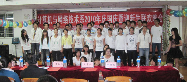 为庆祝中华人民共和国成立61周年,同时为了让2010级新同学更快的融入德赢VWIN官方网站这个大家庭,计算机与网络技术系于9月29日晚上在澄明苑8栋1楼多功能厅举行了计算机与网络技术系庆国庆暨迎新生联欢晚会。院团委办公室主任聂铭、系主任王震江、系党总支书记李海雁、系副主任申时凯、系党总支副书记王亚越、系办公室主任、团总支书记、辅导员、新生班主任及2010级全体新生共计200余人参加本次晚会。