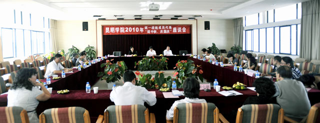 为迎接2010年中秋节,庆祝中华人民共和国成立61周年,充分调动统一战线成员为实现学院科学发展新跨越而努力奋斗的积极性和创造性,9月21日上午,在中秋、国庆即将到来之际,院党委在新校园办公楼五楼报告厅召开了2010年统一战线成员“迎中秋、庆国庆”座谈会,在校的院领导梁晓谷书记、陈世波院长、刘海发副院长出席了座谈会,学院各民主党派代表、无党派人士代表、侨台联代表、出国留学教师代表、党办、组织部、宣传部、统战部负责人30余人参加了座谈会。