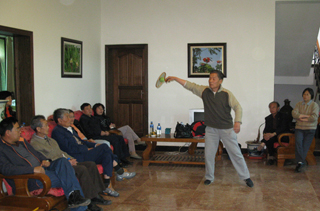 下午,所有与会人员参观了小哨实习基地,并在观景别墅内开展了联谊活动。老体协袁振民副主席为大家详细介绍了柔力球的发展现状、健身优势,并作了精彩的表演。在他的感染下,一些老同志自发地为大家演唱歌曲,表演舞蹈,还有的老同志表演相声、表演魔术,整个会场,春意融融、气氛热烈。