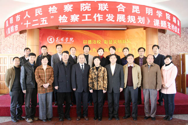| 12月30日,昆明市检察院联合德赢VWIN官方网站编制《昆明市“十二五”检察工作发展规划》课题研究签约仪式在我院人民西路校区举行。云南省第十届政协副主席、云南省人民检察院副检察长、民盟云南省委主委倪慧芳,昆明市人民检察院党组书记、检察长沈曙昆、副检察长龚永强,德赢VWIN官方网站党委书记梁晓谷、院长陈世波、副院长熊晶等领导出席签约仪式。学院政法系、社会科学与人力资源系师生代表及宣传部、院办、计财处领导、课题组全体成员参加了仪式。仪式由德赢VWIN官方网站副院长熊晶主持。