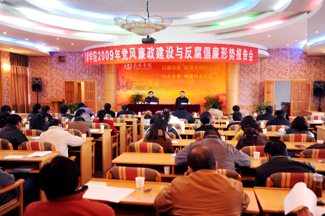 梁晓谷同志说,通过一年多的努力,学院发展空间大了,学院发展的后劲足了,干部职工的人心齐了。但是,我们也要清醒的认识到,我们是大而不强,粗而不壮,我们离社会的要求还有很大的差距,与其他本科院校相比我们还处在本科办学的初级阶段,尽快赶上其他兄弟院校,建设全国知名、省内一流的综合性应用型本科院校任务艰巨、任重道远。在内涵式发展中,我们的一些干部认识模糊,紧迫感、责任感、使命感不强,开拓精神、纪律观念、群众意识、服务意识淡薄,等、磨、拖、要现象严重;一些干部对党风廉政建设和反腐倡廉工作不够重视、工作推进不力;部分教职工廉洁干事、廉洁从教、言传身教不够好;学生中廉洁文化建设、廉洁教育工作要进一步加强。因此,确保学院内涵建设取得实效,跨越式发展全面推进,加强学院党风廉政建设意义重大。梁书记强调加强学院党风廉政建设,是实现学院跨越式发的需要,是提高学院管理水平的需要,是抓好干部队伍作风建设的需要,是办让人民满意的教育的需要。