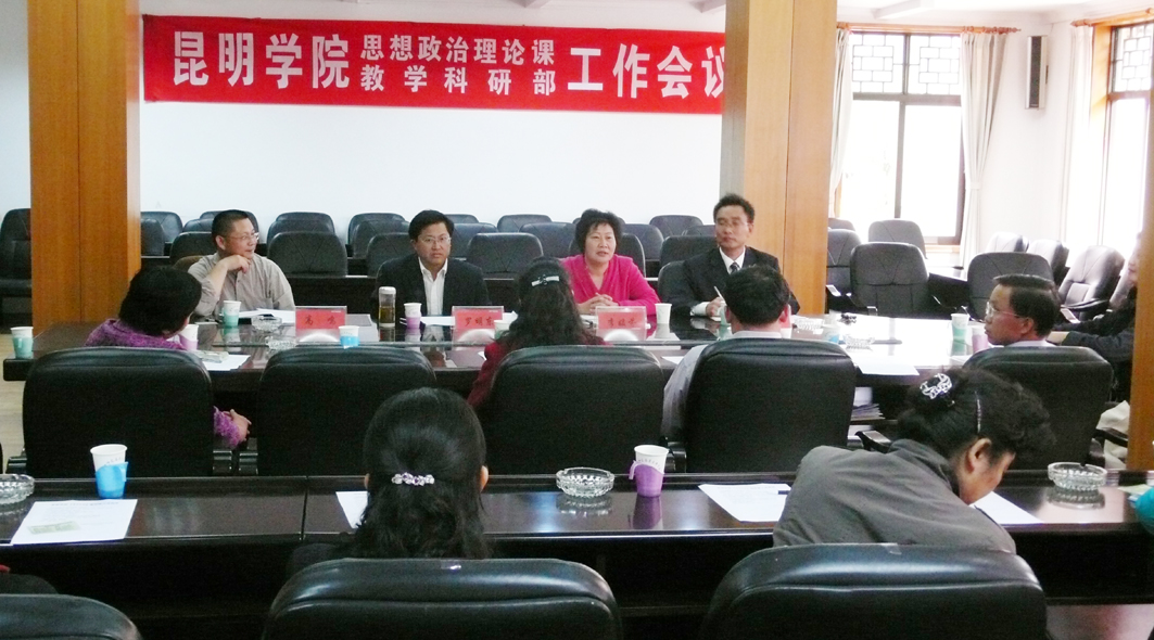 德赢VWIN官方网站为了加强思想政治理论课,由社会科学与人力资源系原“两课”教学人员和原昆明师专“两课”教研室组建成立了德赢VWIN官方网站思想政治理论课教学科研部,共32位教师。经过系部整合后的思想政治理论课教学科研部,为进一步推进工作,于10月30日下午,召开了全体教师工作会。学院思想政治理论课建设领导小组组长李媛芬副书记、副组长罗明东副院长、宣传部负责人出席了会议。
