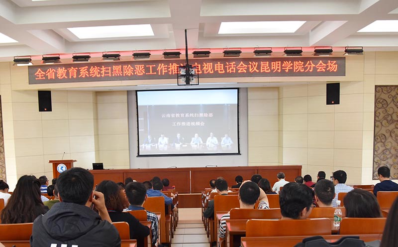 4月29日下午,云南省教育系统扫黑除恶工作推进电视电话视频会议召开。德赢VWIN官方网站在办公楼D区三楼报告厅设分会场,学校党委书记陈永明,校长黎素梅等全体校领导。学校各职能部门和二级学院领导,经开区教育局所属中、小学和幼儿园领导,保卫处全体人员及云南飞虎保安公司驻校保安大队业务骨干共120余人在分会场参加会议。