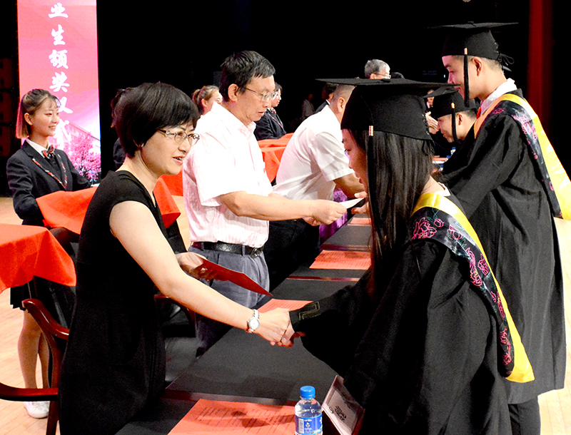 与会领导为荣获省级优秀毕业生代表和毕业生代表分别颁发荣誉证书和毕业证书,并为基层就业优秀毕业生佩戴绶带。同时,向21名外国留学生颁发毕业证书,祝贺他们取得成绩圆满完成学业顺利毕业。