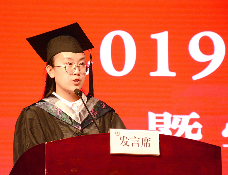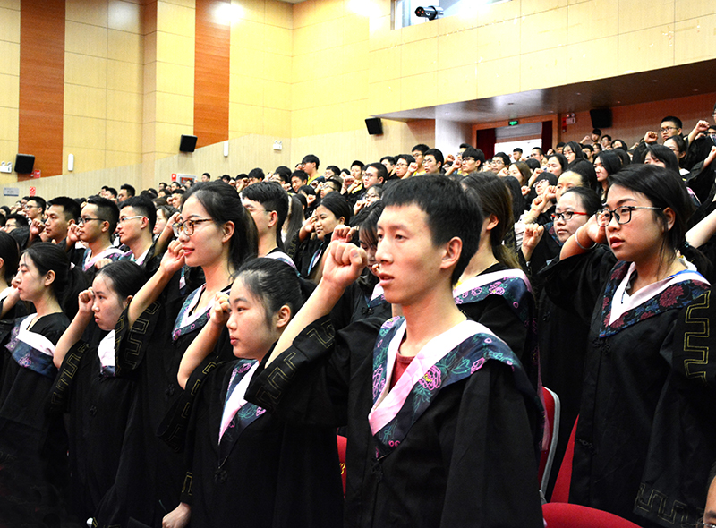 最后,2019届毕业生在主持人的带领下庄严宣誓:“铭记“明德至善 知行利物”的校训,恪守做人准则,肩负时代使命,修德惟真铸品格,博识笃行圆梦想,以国家利益为重,做有益于社会、有益于人民的人,用青春和汗水开拓未来,用聪慧和才智奉献社会。”