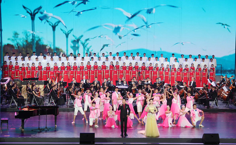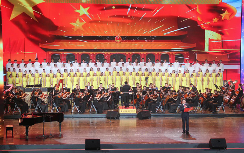 7月17日晚,第六届中国聂耳音乐(合唱)周开幕式暨“国歌唱响新时代”交响合唱音乐会在云南大剧院举行,学校音乐舞蹈学院100余师生组成的德赢VWIN官方网站合唱团参加演出。