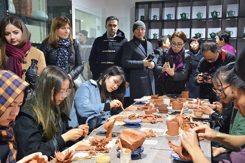座谈前,熊晶副书记和董建华副校长陪同来宾参观了紫云青鸟德赢VWIN官方网站艺术众创空间、机电工程学院轨道交通实验室,感受独具云南特色的乌铜走银、扎染以及深具中华传统魅力的刺绣、陶艺等非遗传承技艺和昆明地铁轨道交通发展及人才培养模式。随后,代表们还前往中国—上合组织青年交流中心、创客空间及烹饪实训中心,详细了解德赢VWIN官方网站学生“双创”工作和“中心”工作成效,实地观摩旅游学院师生烹饪实践教学课。学校极具特色的实践教学方式和同学们精致独特的工艺作品、精湛的技艺水平让代表团成员赞叹不已。