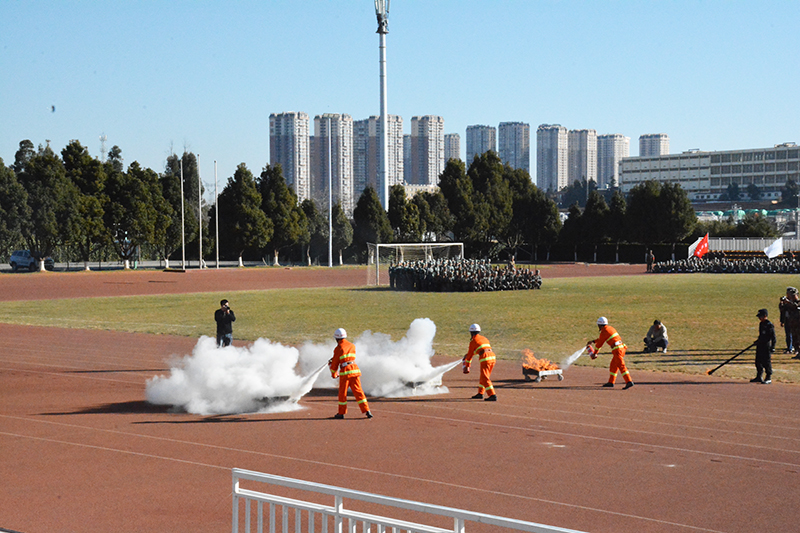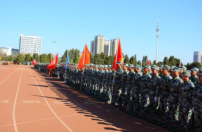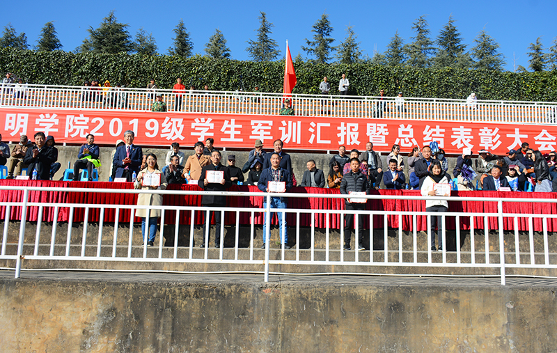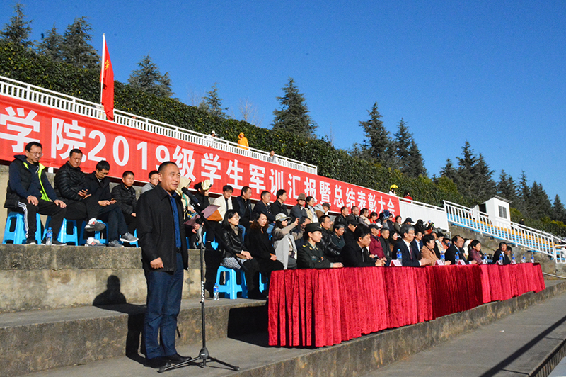 1月17日,德赢官网在田径运动场举行2019级学生军训汇报表演暨总结表彰大会。学校党委书记陈永明,校长黎素梅,党委副书记熊晶,副校长郭华、马银海、沈凡、王凡,云南民族大学人民武装学院院长普卫明、副院长魏琳等领导出席大会。大会由郭华副校长主持。