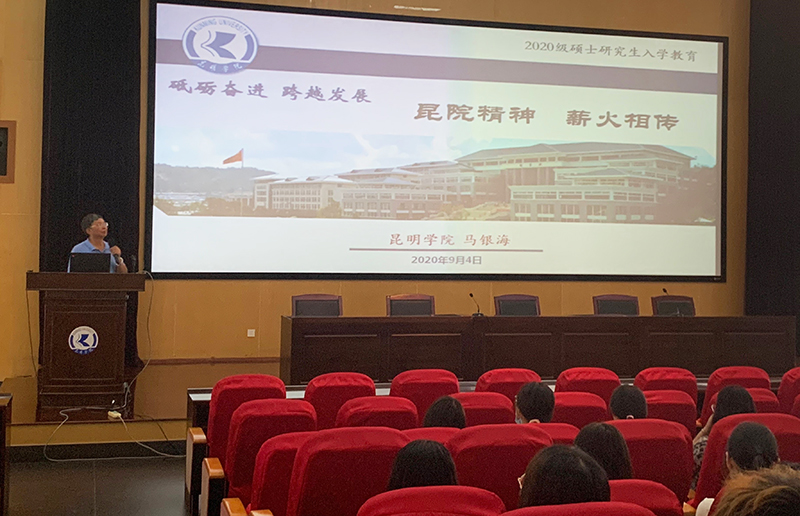 在入学教育开班仪式上,马银海副校长以《昆院精神 薪火相传》为题,从学校发展定位、校史校情、教学科研和学术创新等方面进行了介绍,并结合自身教书育人的经历,引导新生树立远大理想、热爱伟大祖国、担当时代责任、遵守科学道德和学术诚信,做德赢VWIN官方网站学脉传承者,学术创新探索者,复兴大业建功者。