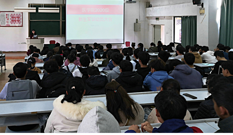 20201231日,医学院在博识楼2001阶梯教室举行2020级新生军训动员暨征兵宣传大会。学院党委副书记李杨作动员讲话,特邀退役士兵陈俊贤进行征兵宣传。军训带队辅导员耿明、邹云光及全体参训同学共280余人参加本次大会。