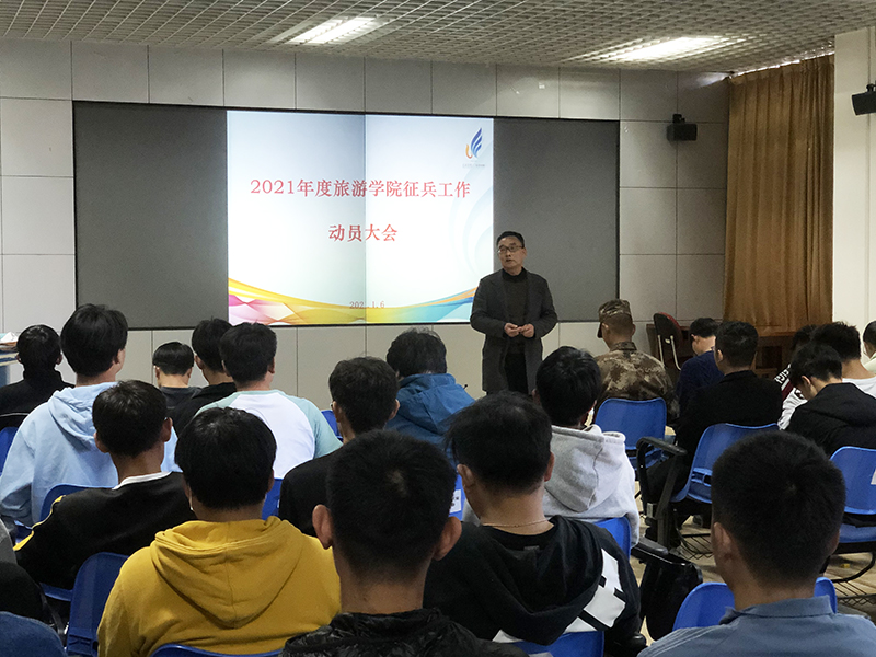 1月6日,旅游学院在惟行楼模拟导游实验室召开2021年度旅游学院征兵工作动员大会,特别邀请旅游学院在读学生、退伍军人、2021年德赢VWIN官方网站学生军训教官余发刚同学作参军宣讲。会议由学院党委副书记刘艳萍主持,党委书记王建华出席并作动员讲话。