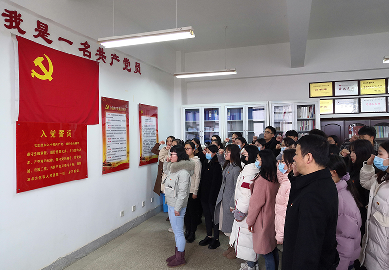 宣誓仪式在雄壮的《国际歌》声中拉开序幕,组织员陈兵老师宣读了参加宣誓大会的预备党员名单。随后,预备党员和参加仪式的老党员一起面对鲜红的党旗,在李杨副书记领誓下,右手举拳,神情肃穆,声音洪亮,郑重宣誓。新党员张湫雷代表大家进行了发言,她表示,面对鲜艳的党旗宣誓,心情无比的激动和自豪,要把入党宣誓作为万里长征迈出的第一步,永远铭记这个神圣的时刻,永远记住向党和人民许下的郑重承诺,终身践行入党誓词。
