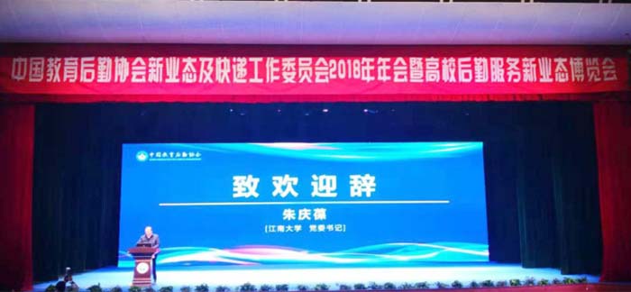 11月24日,中国教育后勤协会新业态及快递工作委员会2018年年会暨高校后勤服务新业态博览会在江南大学文浩馆举行。中国教育后勤协会会长程天权、国家邮政局市场监管司副司长边作栋、江苏省邮政管理局副局长蒋波、江南大学党委书记朱庆葆等领导及相关行业组织代表近300人参会。
