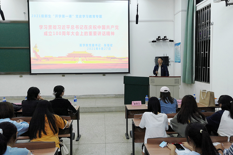 9月27日、28日,医学院在博雅楼2102、2201教室分四场举行2021级新生开学第一课专题教育。医学院党委书记张培宏、院长杨兆宇,党委副书记李杨,副院长陶剑、张高红,以及2021级辅导员、班主任和554名新同学参加了此次教育活动,活动由李杨主持。
