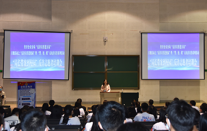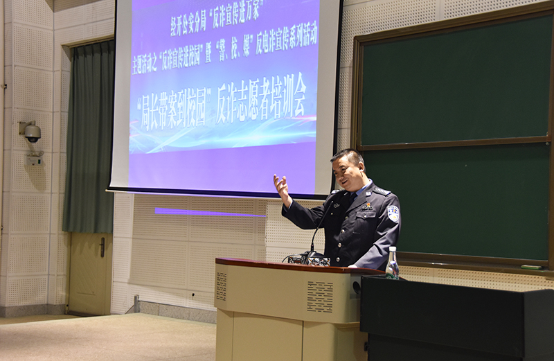 吴胤虹书记向大家介绍“警、校、媒”反诈活动及志愿者服务参与方式。那铮局长用工作中真实而生动的案例向志愿者们讲述了诈骗分子行骗的手段,及其如何预防。心理健康与咨询中心主任王荔老师从心理学的角度分析了学生上当受骗的心理状况,并揭示了骗局的心理技术。