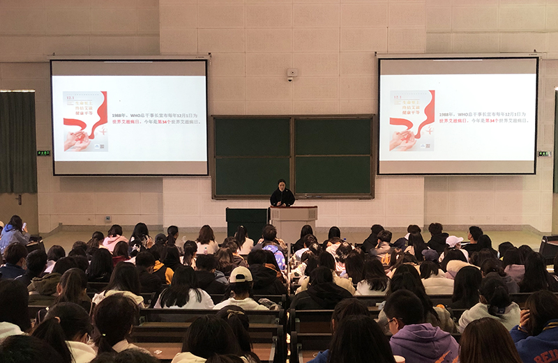 王晶莹老师介绍了艾滋病的基本情况、全球的发病率以及云南和昆明的实际情况,告知同学们学习防艾知识的必要性和紧迫性;系统讲述了艾滋病的病因、特点、发病症状、传播途径,并且用生动的案例和图文为学生展示了艾滋病的危害性。随后,对防艾理论知识和日常生活中的防艾常识进行了普及,教育同学们系统认识艾滋病,理性看待艾滋病,积极预防艾滋病,携手帮助艾滋病患者。讲座的最后,王晶莹老师还针对大学生日常行为和容易走入的误区,用游戏的方式,组织部分学生上台亲身参与防艾与性健康知识的实操部分。
