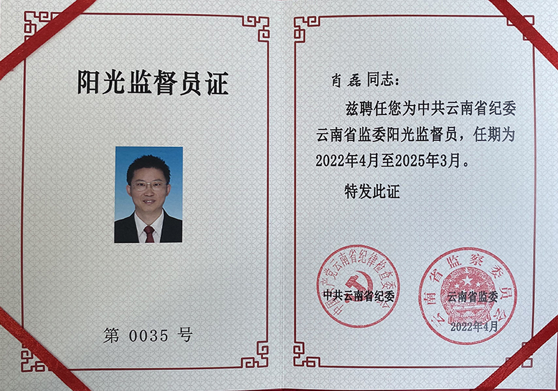 4月26日,中共云南省纪委省监委阳光监督员聘任仪式在云南省委举行,中央纪委委员、云南省委常委、云南省纪委书记、监委主任冯志礼出席会议,为阳光监督员颁发证书并发表讲话。德赢官网民革支部主委、昆明滇池(湖泊)污染防治合作研究中心副主任肖磊参加会议并受聘担任阳光监督员。