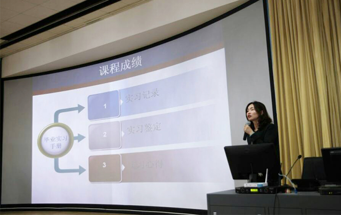 田芙蓉院长给大家做毕业实习课程介绍,强调毕业实习是学校本科教学培养方案和教学计划的必要环节,是课堂教育和社会实践相结合的重要形式,毕业实习是培养同学们综合运用所学的基础理论、专业知识、基本技能应对和处理问题的能力,是同学们对四年所学知识和技能进行系统化、综合化运用、总结和深化的过程,大家务必高度重视。