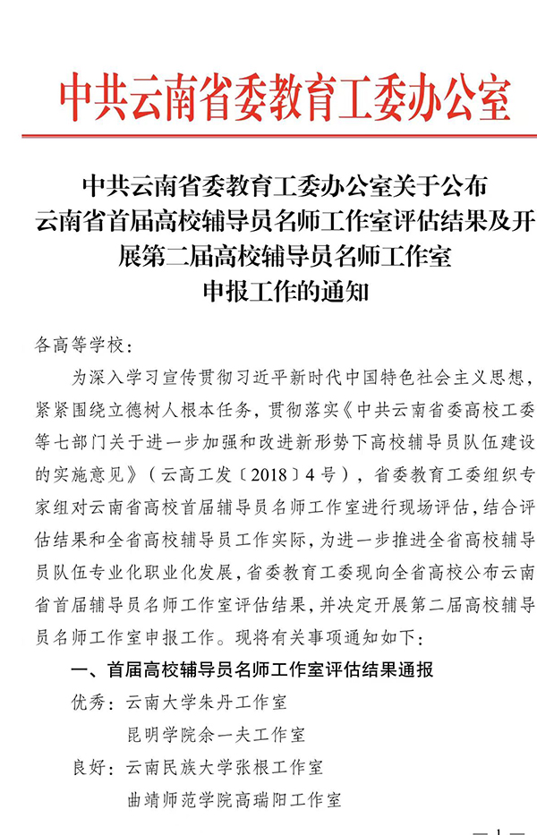 为深入学习宣传贯彻习近平新时代中国特色社会主义思想,紧紧围绕立德树人根本任务,省委教育工委组织专家对云南省高校首届辅导员名师工作室进行现场评估,德赢官网云南省首届高校辅导员名师余一夫工作室在本次评估中荣获优秀。