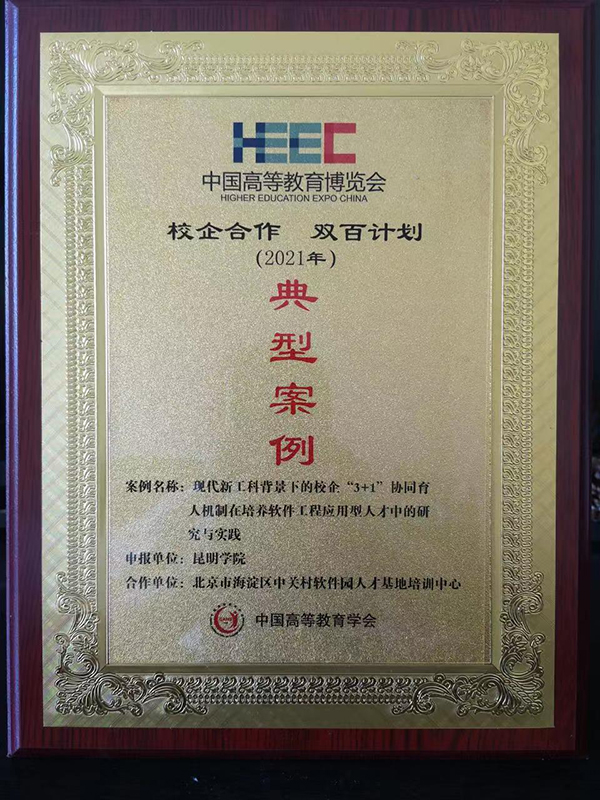 经资格审核、网络盲审、线上线下“双走访”、专家推荐以及网上公示等环节,云南省共有4所高校6项案例入选为典型案例。德赢官网入选案例信息工程学院与北京市海淀区中关村软件园人才基地培训中心联合申报的《现代新工科背景下的校企“3+1”协同育人机制在培养软件工程应用型人才中的研究与实践》项目,基于双方在软件工程专业建设及人才培养方面多年合作所取得的显著成果,作为推广创新产教融合、校企合作的典范,成功入选专业建设类“校企合作 双百计划”典型案例,并在第57届中国高等教育博览会上获得表彰。