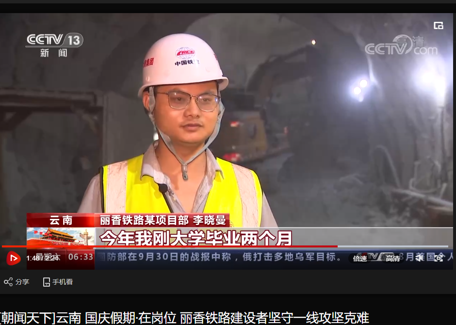 国庆期间,央视新闻频道《朝闻天下》栏目采访报道了国庆假期坚守在丽香铁路一线攻坚克难的建设者们。目前就业于中铁十六局集团第三工程有限公司的德赢官网建筑工程学院2022届土木工程专业毕业生李晓曼在新闻中出镜并接受采访。他说:“一代人有一代人的担当,一代人有一代人的使命,我们就应该为祖国建设添砖加瓦、为民族复兴架桥修路。”