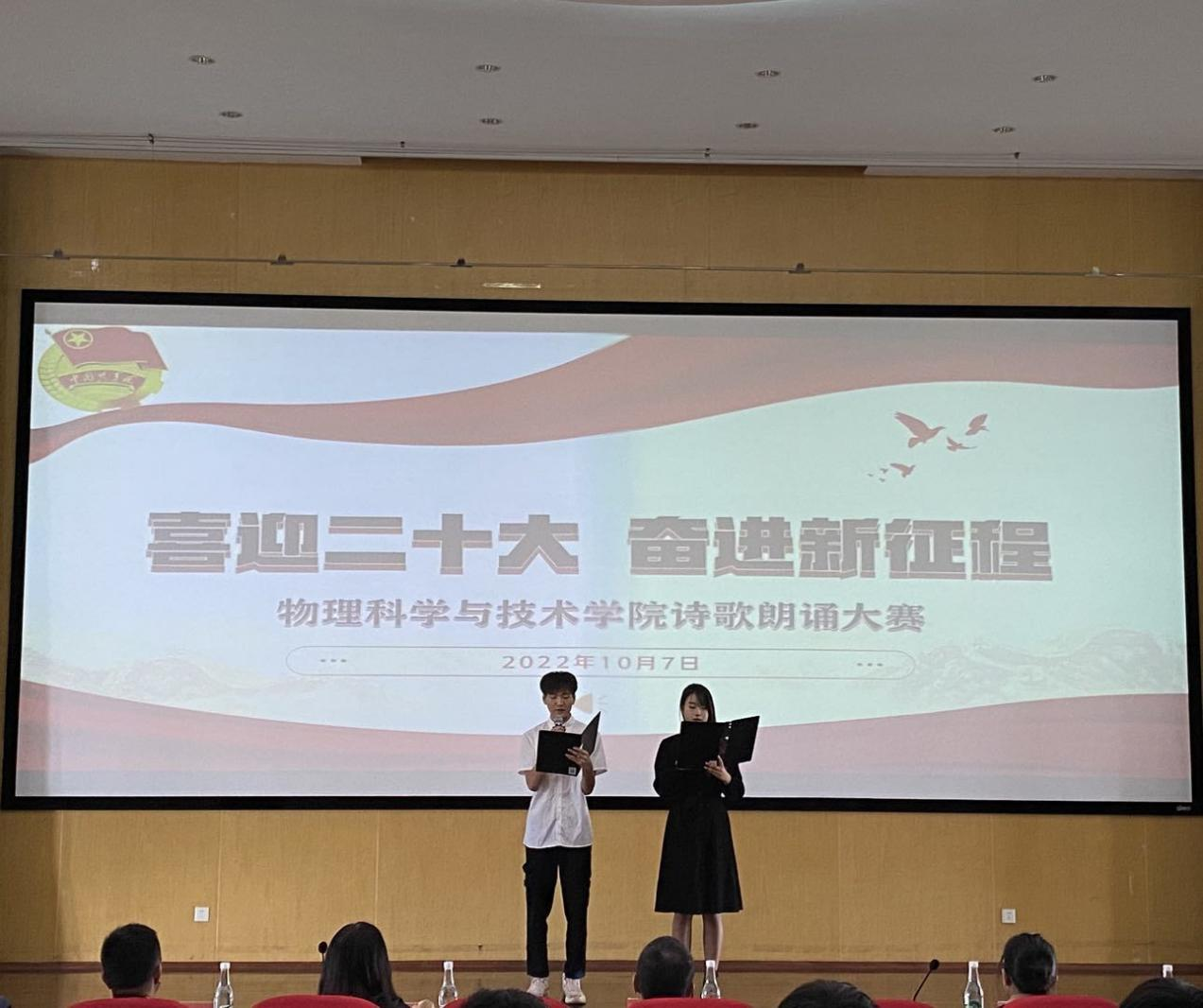 10 月 7 日,物理科学与技术学院举办“喜迎二十大 奋进新征程”师生主题诗歌朗诵大赛。比赛邀请了云南电视台张小云老师,云南音像出版社秦毅老师担任评委,学院全体教职工和学生代表参加。